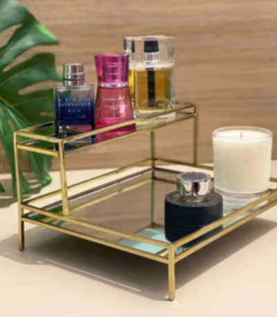Cosmetic storage transparent makeup organizer 2 tier glass trays.